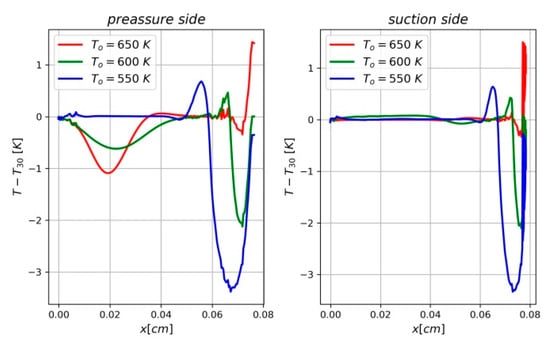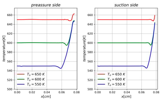 The increase of the protective layer thickness did not significantly improve conditions of heat exchange in the vicinity of the blade’s trailing edge. This can be interpreted as follows: the protective layer allows for limiting the heat flow into the blade’s interior to enable removing heat by convection and by conduction through the porous material placed inside the cooling channel. Due to the thickness of the same blade in the region close to the trailing edge, it is impossible to transfer such an amount of heat to the porous material to achieve a temperature approximately equal to. Only for To = 650 K this was possible.