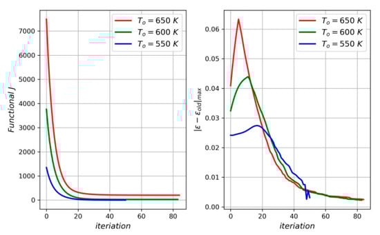 The accuracy of the algorithm operation for the protective coating thickness of 30 μm is presented in Figure 5 (left). It is noticeable that in subsequent steps of iteration, the value of the functional (6) decreases. The same figure (right) shows the course of the distribution of the maximum value of the porosity difference |ε − εold|max in subsequent steps of iteration. The algorithm completes its operation when the value of this difference drops below 0.002.