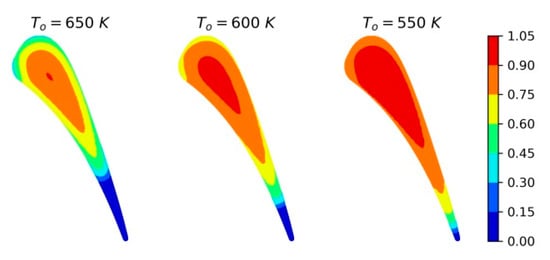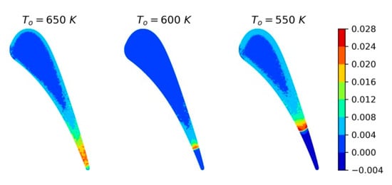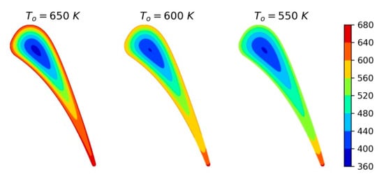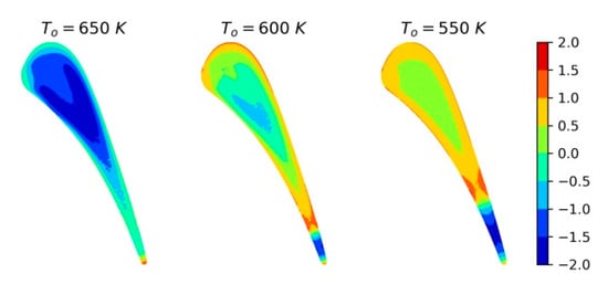 Figure 4 presents the distribution of temperature on the boundary between the protective coating and the blade’s surface for the protective coating being 30 μm-thick. This distribution was approximated in the iteration process to the temperature To given on the contact area between the protective coating and the material the blade is made of. When compared with the assumed value of temperature To, the greatest differences occur in the vicinity of the trailing edge, both, on the suction side and on the pressure side of the blade. The region where these differences occur widens while the value of temperature To decreases.
