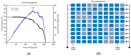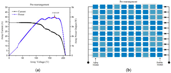 The output result for the 10 × 10 PV array. (a) PV array without rearrangement. (b) The aging modules were covered with a plastic cap for clarification.