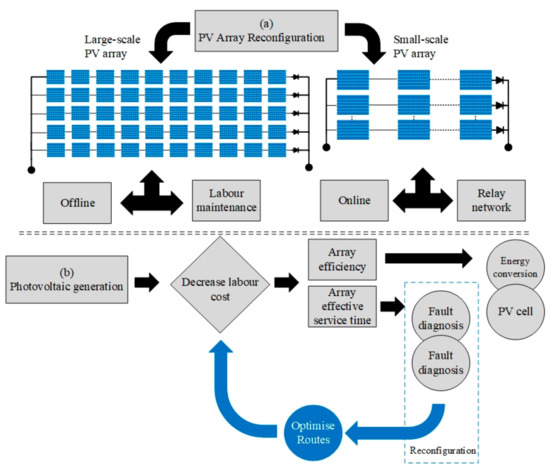 Furthermore, in small-scale PV arrays, the look-up table method has been developed, which cannot be used effectively for large PV arrays [28]. [5] generated a thorough search algorithm [4] devised (sorting algorithm) according to the best and worst paradigm to make the selection of a configuration faster. The fuzzy logical algorithm was also suggested in [29] for identifying the best reconfiguration. Additionally, [5] summarized the most effective online reconfiguration concerning the PV array. However, no reports on large-scale PV array reconfiguration are available. PV array reconfiguration is currently mainly used by relay networks that need a large number of relays and have a high device cost. In terms of large-scale PV arrays, the only viable option for reconfiguring PV is to swap PV modules offline by human labor. An example of such a solution is presented in Figure 5 and Figure 6).