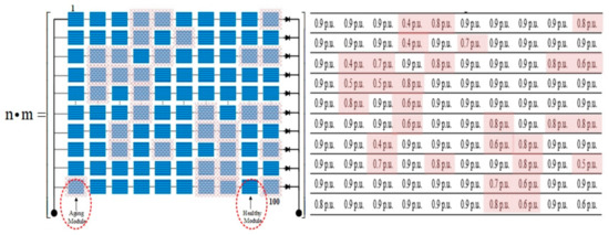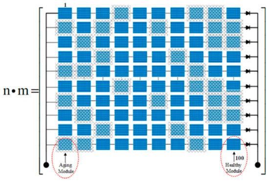 PV modules tend to be located in an exacting outdoor environment and are thus damaged by various factors such as storms, wind, bird droppings, and hail, which leads to the modules becoming non-uniformly aged, thus adversely impacting their efficiency as well as the array’s overall efficiency [1]. However, the differences in the cell characteristics of a module involve other factors concerning the modules’ non-uniform aging. An aged PV array’s performance can be easily and rapidly improved by replacing the aged modules with new ones. However, not only can this be economically costly for the power plant owner, but the discrepancy in the specifications of other modules that were previously healthy with replaced modules as well as the bucket effect phenomenon may hinder the extraction of the best power of the array [2,3].