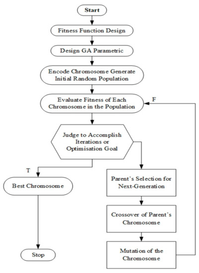 The configuration generating the highest power out of all potential connection patterns with the smallest number of PV module substitutions can be identified based on GEA. This algorithm is advantageous because it can undertake a local arbitrary search to some extent and mutation processes can speed up the convergence to an improved solution when the iteration is near an improved solution for a given number of times; moreover, it hinders precocity by affording multiple practical solutions. GEA application requires representation of every configuration based on a row of numbers acting as a chromosome and calculation of the power produced by every configuration based on a fitness function. Pre-prepared chromosomes constitute the fitness function inputs. Subsequently, the GEA relies on the fitness function outputs to determine the chromosomes to be chosen as parents for the future generation of chromosomes [3]. This necessitates on and off switching of the GEA-computed PV array module as well as the smallest number of substitutions.