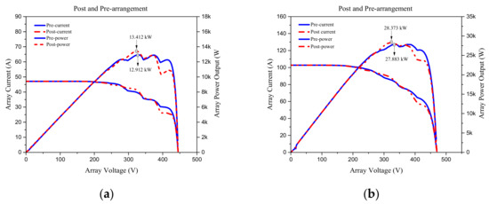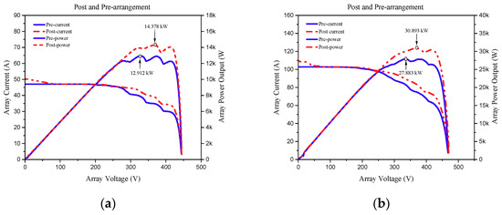 The outputs associated with the two types of 10 × 10 PV arrays, namely, 18-kW (a) and 43-kW (b) before and after the implementation of reconfiguration.
