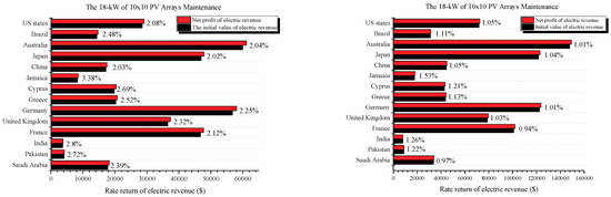 In the earlier part, the enhancement of the output power associated with the 10 × 10 PV arrays was addressed, and the process is illustrated in Figure 13a,b. The outcomes of the simulation are presented in Table 10. It can be seen that manual swap had to be performed 38 times and manual replacing six times, according to the costs associated with electric power and labor force in the fourteen countries that were examined. Meanwhile, Table 11 provides the initial and final rate returns related to the electric revenue of both the 18-kW 10 × 10 PV array and the 43-kW 10 × 10 PV array, but without taking into account the most significant economic advantage. It can thus be observed that, by comparison to the final rate return of electric revenue, the initial rate return of electric revenue before reconfiguration is lower. This reflects the positive effect of the suggested approach, which determined an 11.35% increase in the electric revenue of the 18-kW 10 × 10 PV array in all of the examined countries following the implementation of reconfiguration. Similarly, the approach also had a favorable impact on the 43-kW 10 × 10 PV array, increasing the related electric revenue by 10.8% in all of the fourteen countries according to Table 11.