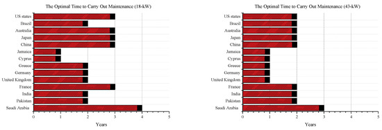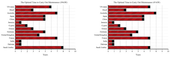 The analysis that was performed based on the same interval of maintenance applied in the earlier part revealed that suboptimal electric revenue was achieved. This can be attributed to the fact that the substitution of solar panels with new ones in countries like Pakistan, India, and Jamaica is highly expensive. On the other hand, the rate of the electric revenue was medium in the case of the other countries that were analyzed. Thus, it was concluded that, in the case of the latter, maintenance can begin from the second to the fourth year, as indicated in Figure 15. Despite such observations, it can be attested that an approach involving a mixture of PV panel swap and substitution could help to ensure that the performance of midlife maintenance is advantageous in the majority of countries.