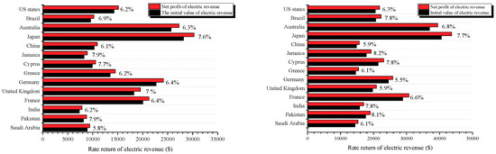 In order to achieve the maximum net profit return, the suggested algorithm yielded a particular maintenance time in each case. This explains the discrepancies that have been noted concerning maintenance times. To give an example, the algorithm indicated that, in countries like Pakistan, India, and Jamaica, maintenance could be carried out in the first year to achieve a net profit from the electric revenue due to the high cost of electricity, but low labor cost. On the other hand, the algorithm indicated that maintenance could be conducted in the second year in countries like Cyprus to attain a better net profit from electric revenue. In contrast, maintenance could be conducted in the third year in Greece and Brazil and in the fourth year in the case of the UK to benefit net profit. Furthermore, maintenance can be carried out in the fifth year in Germany, China, and Japan, and in the sixth year in the U.S. Moreover, the increase in electric revenue profit in France and Australia could be enhanced by undertaking maintenance in the seventh year after PV installation, according to the suggested algorithm. Finally, the algorithm indicated that in a country like Saudi Arabia, maintenance can be carried out in year eight to achieve a net profit from the electric revenue due to the low cost of electricity, but high labor cost. Figure 12 illustrates the increase in electric revenue.