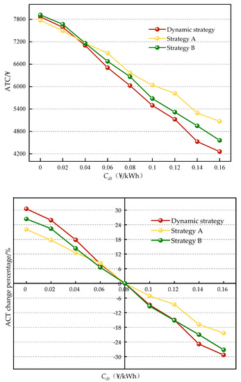 (3) In terms of the influence of the subsidy on the on-grid system cost under different operation strategies, the ATC of the system decreases with the increase of Cdt. Taking Cdt = 0.08 ¥/kWh as a reference, the sensitivity analysis shows that when Cdt fluctuates 25% upwards (downwards), the ATC of the system fluctuates 7.5%, 6.7%, and 5.3% downwards (upwards) under dynamic strategy, strategy B, and strategy A, respectively. The three operation strategies of the grid-connected system can be arranged in descending order as dynamic operation strategy, strategy B, and strategy A. When Cdt ≤ 0.04 ¥/kWh, strategy A is the most suitable for the system; when Cdt > 0.04 ¥/kWh, the dynamic operation strategy yields an ATC much lower than those yielded by the control operation strategies, which means it is the best operation strategy.