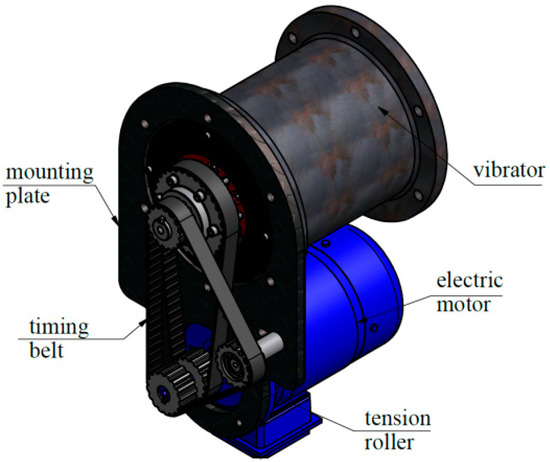 Depending on the technological process and design of the vibration machine, several separated vibrators may be installed [8]. There are obligatory requirements to ensure their stable synchronous rotations, which can be provided by kinematic links via gears or dynamically. In some types of machines, the in-phase rotation is required at multiple frequencies [9,10], as well as implementing the mentioned elliptical trajectories under conditions of gradual wear and cyclic fatigue of supporting springs [11].