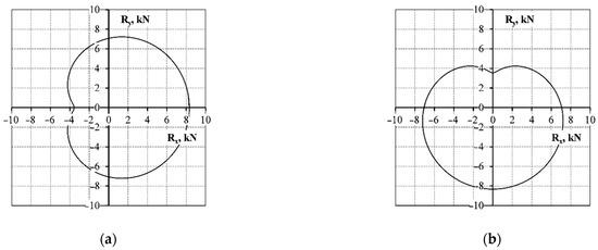 The resulting perturbation according to Equation (2) and Figure 4a is asymmetric and periodic. However, as it turned out, its maximum value Rmax = 8.32 kN does not depend on the difference in the angle of phase shift but depends on the inertial characteristics of unbalanced masses and their rotational frequencies.