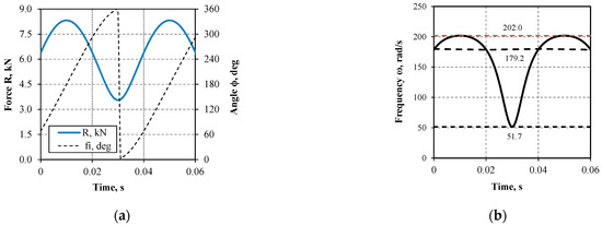 Regardless of the set initial value of the phase shift angle φ, developed drive produces the periodic resulting force, which varies within a range R(t) = 3.55–8.32 kN (see Figure 4a) and instant frequency range ω(t) = 51.7–202.0 rad/s (see Figure 4b) with median value about 179.2 rad/s.