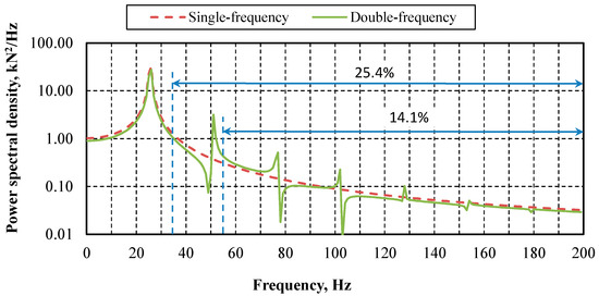 The spectral composition of the resulting force is shown in Figure 5. The effective range is limited to 200 Hz for the assumed frequencies of shafts rotation. In addition to the two frequencies of excitation with the main peaks about 26 Hz and 51 Hz, the higher harmonics are also excited due to non-symmetrical waveform of resulting force.