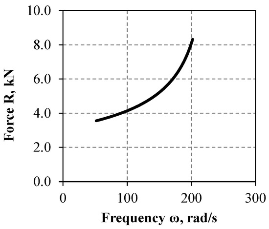 The non-linear relation of resulting inertial force R(t) and instant frequency ω(t) is shown in Figure 6. In contrast, the power characteristic of industrial single-frequency vibrators has the form of a point at this diagram. Using such graphs, designers can synthesize working characteristics of dual-frequency vibrators depending on specific requirements of technological processes.
