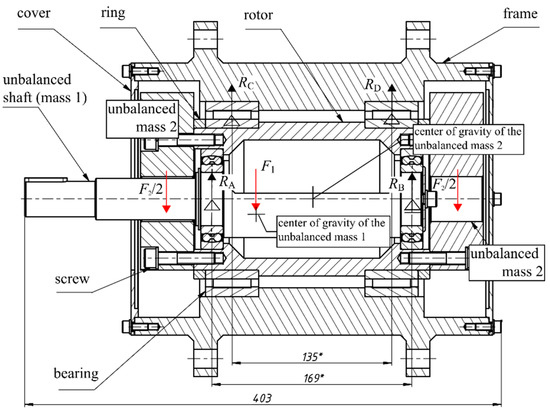 The main elements of a dual-frequency inertial vibrator (see Figure 7) are the central unbalanced shaft and unbalanced frame, on the edges of which two unbalanced masses are installed. Inertial force F1 of the unbalanced shaft produces the reaction forces RA and RB in the supports. They act as the additional impacts on unbalanced frame loaded by their inertial force F2. The values of the reactions in the supports of the unbalanced frame RC and RD are accounted for together with reaction forces RA and RB for the selection of bearings in the supports of the vibrator shaft.