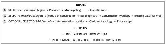 Below the design per tool’s menu is described in Figure 4, with the required inputs per step and outputs. In the Menu, the user is invited to go through three categories of selection: context data; general building data; and additional details.