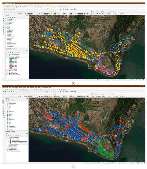 Extract from the Geographic Information System (GIS). (a) Class of construction age; (b) Construction type.