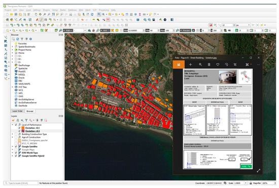 The GIS has therefore made it possible to locate the different buildings in space, linking them to specific alphanumeric attributes saved in the relational database (Archive), and to manage them as “information layers” (Layers) that identify their spatial relations. Each building has been associated with a data sheet containing the information described above to guide the designers’ choices towards the most suitable and sustainable energy efficiency systems (Figure 6) [34].
