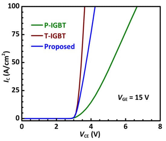 The static characteristics of the IGBTs are explored in this section. Firstly, the basic output characteristics of the three studied SiC IGBTs are investigated as well as compared. The on-state IC-VCE performance is shown in Figure 2. The gate-to-emitter voltage (VGE) is set to be 15 V in on-state, which is the same as the gate drive voltage of Si MOSFET and IGBT for integration, conveniently. The on-state voltage VON of the studied SiC IGBTs is defined as the VCE (when IC is 50 A/cm2 and VGE is 15 V) in this paper. The VON of the P-IGBT is as high as 5.21 V, because the conductivity modulation in P-IGBT is weak due to the grounded p-bodies. This large VON will bring on-state energy loss in the application circuits and should be decreased. On the contrary to the P-IGBT, the T-IGBT obtains quite a lower VON of 3.44 V, which is only 66% of the VON of the P-IGBT. The low VON in the T-IGBT is owing to the enhanced injection enhancement effect, which enlarges the plasma density in the upper region of the T-IGBT. The higher plasma density in the upper region of the T-IGBT can be verified in Figure 3, which shows the plasma concentration along the vertical direction of the three investigated IGBTs. The T-IGBT has a plasma density of about 4 × 1015 cm−3 at the top side of the device, while the plasma density in the P-IGBT at the top side is smaller than the T-IGBT and even lower than 1 × 1015 cm−3. As to the proposed SiC IGBT, the VON is 3.72 V, which is close to that of the T-IGBT and is much smaller than that of the P-IGBT. As shown in Figure 3, the plasma concentration in the upper region of this proposed IGBT is also quite higher than the plasma concentration of the P-IGBT, and close to the plasma density of the T-IGBT. The high plasma density in the proposed IGBT is owing to the heavily doped n-type CSL, which creates a hole barrier preventing the holes in the n-drift region to be extracted out. Hence, the high plasma density in the proposed IGBT enhances conductivity modulation and results in the lower VON of 3.72 V, which is only about 71% of the 5.21 V in the P-IGBT.