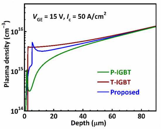 Plasma density in vertical direction of the studied P-IGBT, T-IGBT, and the proposed SiC IGBT at IC = 50 A/cm2.