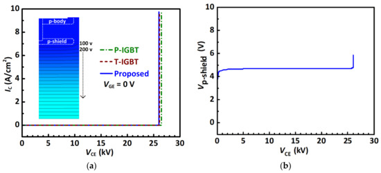 (a) BV performance. The equipotential lines (step = 100 V) of the proposed IGBT under VCE = 20 kV are shown in the inset. (b) The variation of the p-shield voltage (Vp-shield) with the increasing of VCE in the proposed SiC IGBT at off-state.