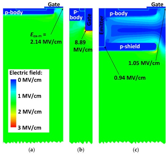 Off-state electric field distribution in the studied SiC IGBTs under VCE = 20 kV and VGE = −5 V. (a) P-IGBT. (b) T-IGBT. (c) The proposed SiC IGBT.