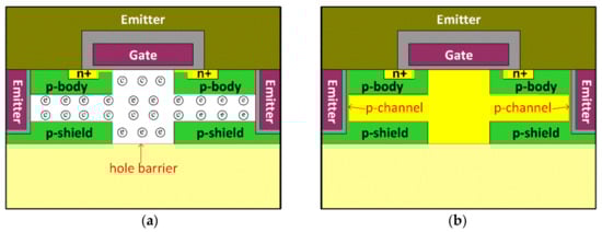 The operation mechanism of the proposed SiC IGBT in on-state as well as in off-state is summarized in Figure 6a,b. In on-state, the higher electron density in the heavily doped n-type CSL creates a high hole barrier. The CSL layer is connected to the grounded n+ emitter in on-state through the n-channel of proposed IGBT. So, the voltage of the CSL layer is also very small and almost zero. The embedded p-MOSFET is turned off in this situation, and no p-channel exists in the embedded p-MOSFET, as shown in Figure 6a. However, at off-state, the p-channel is formed in the proposed IGBT, as shown in Figure 6b. With the potential of p-shield and CSL layers increasing with the off-state collector voltage, the embedded p-MOSFET is turned on. Since the p-shield is connected to the grounded p-body through the induced p-channel, electric field lines emitted from the high voltage side are terminated in this p-shield to avoid the influence of the heavily doped CSL on blocking capability of the IGBT.