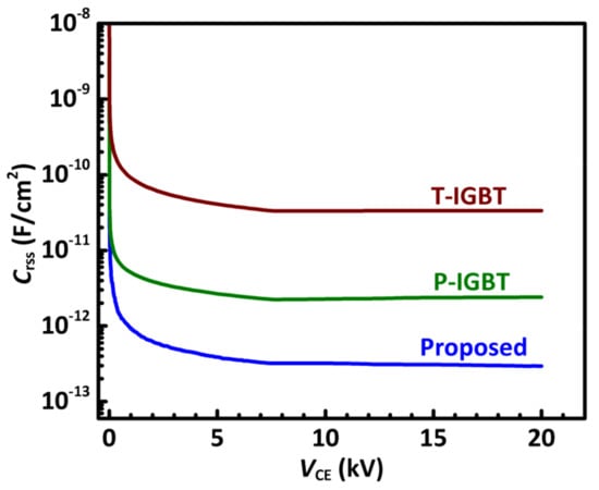 The reverse transfer capacitance (Crss) of a power transistor is also a significant device parameter for device reliability and is necessary to be analyzed [14]. When a power transistor is being switched off, the current decreases from the high on-state current to a very small off-state leakage current, while the collector or drain voltage of the transistor increases from a small on-state voltage to the high DC bus voltage. Although the gate voltage in this switching-off process decreases to be smaller than the threshold voltage of the transistor, the gate voltage is still affected by the increasing collector or drain voltage. Through the reverse transfer capacitance Crss, the gate is coupled to the collector. The gate voltage is also increasing when the collector voltage is larger and larger in this switching-off process. This may result in false turning-on of the transistor, if the gate voltage increases to be larger than the threshold voltage of the transistor again. A low Crss is often desirable, since it can effectively suppress the false turn-on of the power transistors during switching operations, which otherwise would cause reliability issues of the power switching circuits [35]. Figure 7 presents the Crss curves of the studied P-IGBT, T-IGBT, and the proposed SiC IGBT for comparison. The T-IGBT has a very large Crss, because its trench gate protrudes beyond the p-body and hence is strongly coupled to the collector. Thanks to the screening effect from the grounded p-bodies to the planar gate, the P-IGBT has much smaller Crss than the T-IGBT. The proposed IGBT has the lowest Crss among the three studied IGBTs, since the p-body and p-shield collectively screen the planar gate from being affected by the collector.