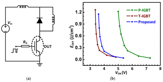 (a) Schematic of the circuit for simulating switching characteristics. (b) EOFF-VON trade-off characteristics of the studied P-IGBT, T-IGBT, and proposed IGBT with changing the doping density of the p-collector region.