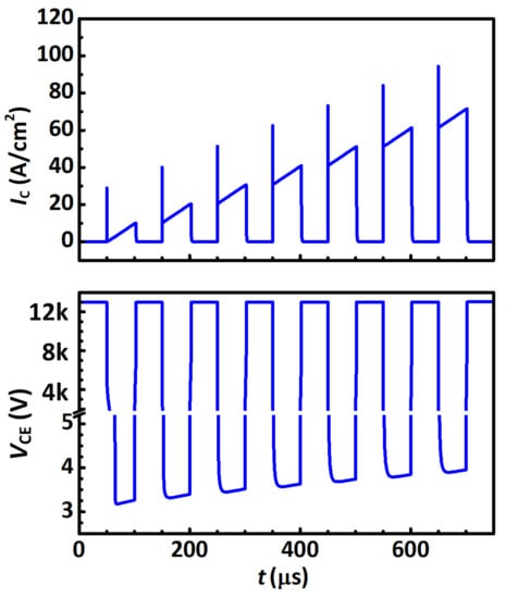 In this paper, the p-shield of the proposed IGBT is not grounded, and the device performance under multi-cycle switching process should be studied. Figure 9 shows multi-cycle switching curves (IC and VCE) of the proposed SiC IGBT. In the set-up, the VGE (not shown in Figure 9) is a square wave with +15 V in half time of a cycle to turn on the proposed IGBT, and −5 V in the other half time of the cycle to turn off the proposed IGBT. As displayed in Figure 9, when the current IC increases in every on-state period in a cycle, the corresponding VCE of the IGBT increases and equals the VON at the same IC in Figure 2. When the IC is 50 A/cm2, the VCE of the proposed IGBT is 3.72 V and is the same as the VON shown in the static characteristics in Figure 2. Thus, unlike the unipolar SiC power MOSFET with floating p-regions, the proposed SiC IGBT as a bipolar device does not suffer a dynamic degradation although the p-shield is not grounded. Same as the MOSFETs, negative charges exist in the p-shields of the proposed SiC IGBT in off-state. However, in the next on-state process, the holes injected from the p-collector of the IGBT can efficiently discharge the stored negative charges in the previous off-state process in multi-cycle switching.