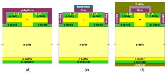 A feasible fabrication procedure of the new SiC IGBT is proposed with a set of established process steps in conventional planar gate SiC IGBT [12,41,42,43]. The proposed fabrication flow is illustrated in Figure 10. The fabrication starts with a SiC substrate with epitaxial n-drift layer. On the n-drift layer, the more heavily doped n-layer can be formed by epitaxial growth or ion implantation. Then p-shield regions are formed by ion implantations. All the implantation should be followed by high-temperature annealing in argon gas. Then, an n-type SiC layer is regrown [42,43], following which, the p-body regions and n+ regions are formed by ion implantations. Then, the trenches are created by dry etching, followed by gate oxide growth or deposition. Post-oxidation annealing is required to obtain a high-quality oxide/SiC interface. A polysilicon layer is then deposited. The planar-gate region is masked, and the polysilicon is etched back; the planar gate of the proposed IGBT and the trench gate of the embedded p-MOSFET are formed simultaneously in this step. The polysilicon and gate oxide can be etched with ICP (inductively coupled plasma etching) or RIE (reactive-ion etching), followed by high-temperature annealing. Then, dielectric isolation and metallization for contacts are carried out.