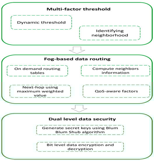 - Two levels of security are provided using cryptographic algorithms; the first level attains data privacy from cluster heads to fog nodes, and in the second level, a more authentic asymmetric encryption scheme is proposed between the fog nodes and cloud servers.