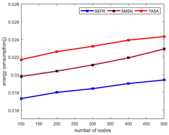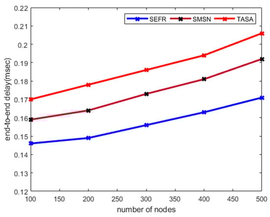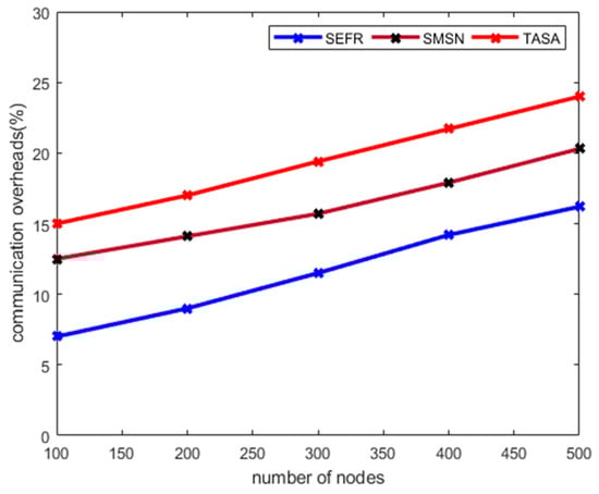 Figure 6 illustrates the performance of the SEFR protocol against existing work in terms of communication overhead. It is seen from the analysis of the simulation-based results that the SEFR protocol improves the communication overhead by 23%, and 32.5%. This is due to it generating steady clusters based on dynamic distance threshold and only allowing appropriate nodes to participate in the selection process of cluster heads. Also, the transmission load is reduced among sensors due to multi-hop communication instead of a direct link. Unlike SMSN and TASA, which increase the call of route maintenance and data re-routing, the SEFR protocol uses the various QoS-aware factors to choose the long run and more stable routing path that decreases the communication cost in terms of route re-discoveries. Along with other parameters, the SEFR protocol also computes the end-to-end distance while selecting the routing path and decreases the network congestion of the transmission links. Furthermore, it increases the performance of network security based on lightweight exclusive OR operation. The security keys are generated using the Blum Blum Shum algorithm and securely interchange between the sensor nodes. The proposed security algorithm protects the sensors’ data from malicious threats with lower link intrusion and contributes to route maintenance.