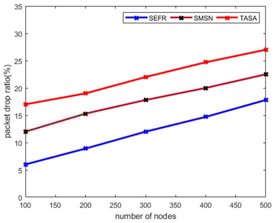 Figure 3 illustrates the performance of the SEFR protocol against SMSN and TASA in terms of packet drop ratio. The experimental results revealed that the SEFR protocol decreases the packet drop ratio by 21%, and 34% under a varying number of nodes. This is because the proposed SEFR protocol selects the most efficient cluster heads in terms of resources and least to long-run routing paths. Also, instead of performing the route discovery in the larger region, the search zone is limited based on the dynamic distance threshold. Unlike the SMSN and TASA, that are more prone to failure in reliable and trusted data routing under a varying number of nodes, the SEFR protocol presents trustworthiness and better lifetime routes for transferring sensors’ data through fog computing. Unlike other solutions that frequently drop the sensors’ data due to excessive route discovery and control packets, the proposed SEFR protocol avoids forwarding the packets on an obstructed route based on the packet queuing factor.