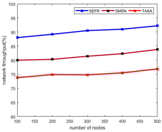 Figure 5 demonstrates the performance of the SEFR protocol for network throughput in the comparison of existing work. The results showed that the SEFR protocol increases the ratio of network throughput under a varying number of nodes by 10 and 20%. The improvement is due to the fact that it utilizes multi-facet-based QoS attributes to determine the energy-efficiency and reliable data forwarders. Also, the cluster heads and fog nodes that are more powerful in terms of resources are selected for data routing towards the cloud server. Moreover, compared existing solutions that overlooked the data privacy and authentication during the routing phase, and lead to compromised network performance in terms of security, the SEFR protocol makes use of the Blum Blum Shub algorithm to ensure data confidentiality and avoid malicious nodes being part of the routing process. The basic purpose of using such an algorithm is to impose lower processing and memory overheads on smart sensors. The SEFR protocol efficiently detects the malicious nodes and avoiding network congestion by utilizing the packet queuing factor, which results in maintaining high throughput. Also, the proposed security scheme randomizes the secrets and increases the level of data encryption and decryption. Such secure methods make the data routing more consistent for network throughput and neglect the probabilities of security threats to affect the reception of sensor data.