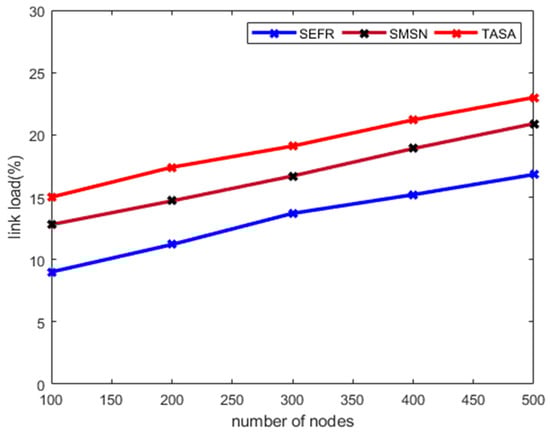 Figure 7 depicts the measurement of the SEFR protocol compared to other solutions in terms of link load. It is noticed that the experimental results improve the load on wireless links by 20% and 27% as compared to SMSN and TASA. This is due to the fact that SEFR increases the utilization of data links efficiently and maintains a load of transmitted packets in a balanced manner. Also, the multi-facet QoS factors including packet queuing rotate the data forwarders and decrease the number of route request-response messages, which results in efficient load balancing. Also, existing solutions frequently generate bogus route discoveries packets and make the data links more congested. The proposed SEFR protocol makes use of secret numbers using the Blum Blum Shum algorithm and avoids the chances for malicious nodes to integrate the false information in actual data packets. As a result, the proposed SEFR protocol minimizes the unnecessary data traffic on the selected links and makes the communication more flexible and trusted.