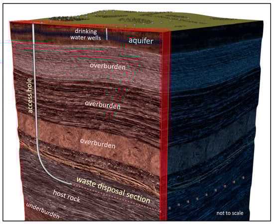 This configuration with an overpressured saline formation is a conservative feature selected to promote flow diagonally upward throughout the entire repository system, pushing contaminated fluid horizontally along the disposal section and then upwards along the vertical access hole. Such modest overpressures encountered in deeper sedimentary rocks may derive from a local or regional, geometrically imposed fluid dynamic pressure transfer, such as gas migration updip along an inclined reservoir. Not only in areas with high structural relief, but also in low-relief deltaic environments, compaction disequilibrium may cause large pressure compartmentalization, leading to undercompacted shales that exhibit high overpressures [51,52]. Hydrocarbon generation (with fluid or gas expansion) has been described as a pressure generator [53], and diagenesis (clay smectite-illite transformation), tectonic compression, and pressure transfer can all play important roles. Finally, the advancement and retreat of thick ice sheets during transitions between glaciation and inter-glaciation periods also lead to changes in effective stress and pore pressures between units of different compressive strength [54,55,56,57].