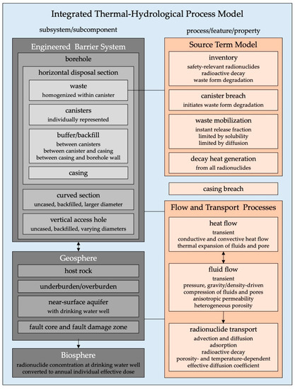 A single numerical model has been developed, which captures the main subcomponents of the repository system and their interactions in an integrated manner [45,46]. Furthermore, thermal–hydrological processes and their impact on radionuclide transport are fully coupled. Figure 2 shows the subcomponents and processes combined in this mechanistic safety analysis model of a generic horizontal borehole repository. The EBS and geosphere are both represented in their entirety and evaluated jointly using a shared set of governing equations, which promotes conceptual and parametric consistency and ensures that interactions and feedback mechanisms are inherently accounted for. (As will be discussed below, capturing such interactions between the borehole and the geological environment is essential to properly evaluate the role that backfilling and sealing play in the context of overall repository performance.) Heat and radionuclides are released from individually represented waste canisters and are transported within the various engineered components of the borehole. They also migrate and dissipate into the geological far field before they reach the near-surface aquifer and from there the biosphere. Processes in the biosphere are lumped into a dose coefficient of 1.1 × 10−7 Sv Bq−1 [47], which (combined with the water consumption rate) measures the radiological impact of ingesting water contaminated with radionuclides, assuming that the exposed individual drinks water exclusively from the well centered above the repository.