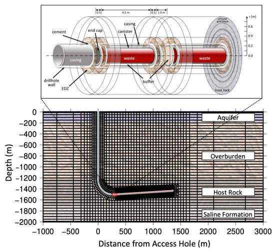 The deep casing can be removed after waste emplacement in the vertical sections that penetrate deformable formations, thus promoting compression of the backfill material and self-sealing. Shallow casing protecting the critical aquifer zone will remain fully cemented and tested per regulatory requirements. Plugs may be placed at select locations within the vertical access hole by reaming the borehole and filling it with a suitable material that is compacted by the overburden and plastic deformation of the surrounding rock [31,32]. Such plugs effectively isolate the disposal section from the surface and seal the drilling-disturbed zone around the borehole. Plugs may also be installed throughout the horizontal leg of the borehole to compartmentalize the waste-containing borehole section, thus reducing the possibility that radionuclides are transported axially toward transmissive zones intersecting the borehole. It should be noted that the United States Environmental Protection Agency’s Underground Injection Control regulations and drinking water act provisions consider the most common plugs (cast iron bridge plugs) to be non-permanent, requiring cement isolation directly above them.