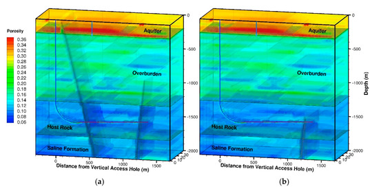 Porosity distribution within modeled symmetry cell, showing hydrostratigraphy and location and extent of (a) two faults and (b) one fault intersecting the sub-horizontal disposal section of the borehole repository. Note that the actual model domain extends in the X-direction from −2200 to 3550 m. Applying symmetric boundary conditions at the X-Z planes is equivalent to the assumption of an infinite number of wells spaced 100 m apart in the Y-direction.