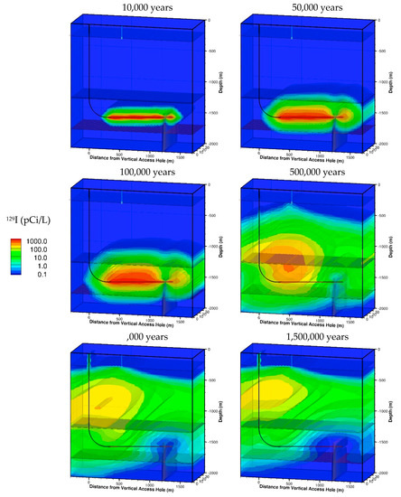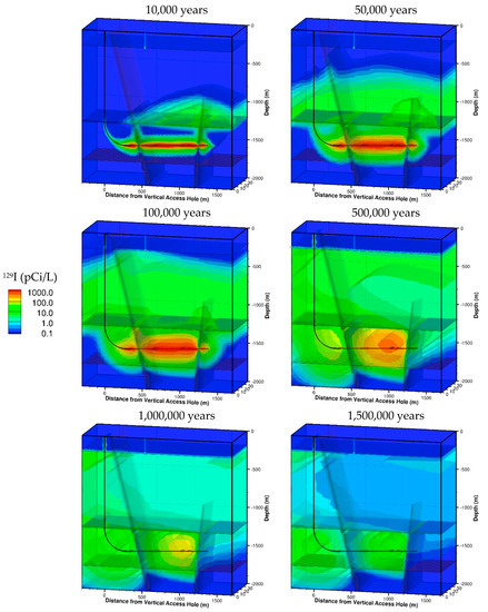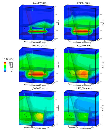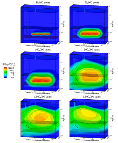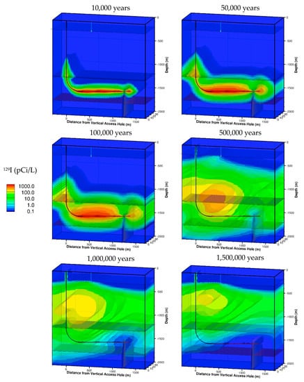 The results from the main scenario of interest are visualized in Figure 7. Here, the backfill in the vertical and curved sections of the access hole as well as the horizontal waste disposal section is of relatively high permeability, i.e., it does not fulfill a hydraulic sealing function. As a result, radionuclides released from the breached waste canisters are displaced axially along the curved section, driven by the overpressure from the left fault intersecting the repository. This preferential flow and advective transport of 129I along the borehole is most evident after 10,000 years (see the first panel in Figure 7); it is also highlighted in Figure 8, which shows the early-time radionuclide transport from the disposal section along the curved and eventually vertical access hole, along with its radial penetration of the surrounding host rock and overburden.