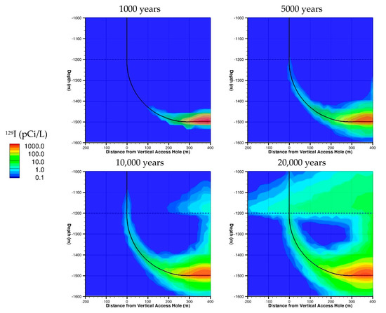 The activity in the near field of the access hole has the shape of a curved cone, which is the result of diffusive losses of 129I from the borehole into the tight host rock. Once radionuclides enter the vertical section, radial fluid losses from the overpressured access hole into the higher-permeable overburden and associated advective removal of 129I supplement the diffusive losses. Consequently, the vertical flow velocity in the borehole reduces exponentially, and so does the 129I concentrations within the upwards-flowing water. After a very short flow distance within the vertical access hole, the axial flow rate and radionuclide concentrations within the vertical access hole are very small, and the vertical migration of 129I essentially ceases. This is a result of the fact that the cross-sectional area available for radial losses changes linearly as contaminated water flows up the access hole, whereas the circular area for transport along the axis of the borehole is both small and remains constant. This interpretation is consistent with a similar calculation of diffusive losses from a deep vertical borehole made with a cylindrical submodel [10].