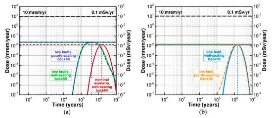 For waste disposal in deep vertical boreholes, a sensitivity analysis indicated that upward thermal convection occurs during the thermal period if the seal system is substantially degraded [42,43]. A probabilistic performance assessment calculation and associated partial rank correlation analysis identified the permeability of the degraded borehole seal and surrounding damage zone as the most influential parameters regarding the calculated radiological dose. Notably, the maximum dose was a factor of 100 below a dose standard of 0.1 mSv yr−1 (10 mrem yr−1) even if the damage zone with a cross-sectional area of 1 m2 had a high permeability of 10−12 m2.