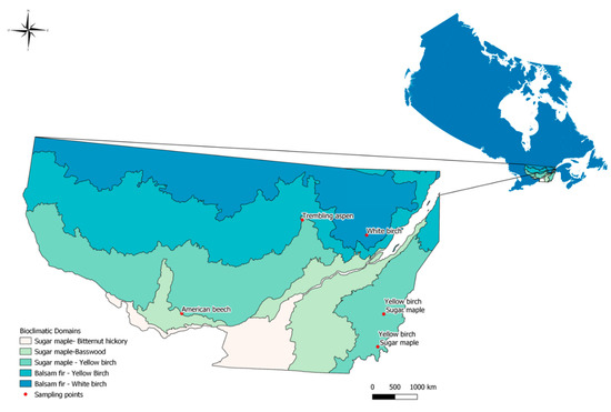 Five different species, indigenous to the province of Quebec, including sugar maple (Acer saccharum Marshall), yellow birch (Betula alleghaniensis Britt.), white birch (Betula papyrifera Marshall), American beech (Fagus grandifolia Ehrh.) and trembling aspen (Populus tremuloides Michx.), were sampled in different study areas across Quebec’s temperate hardwood forest and the southern limit of the boreal forest. Sampling sites were spread across the following bioclimatic domains: sugar maple-basswood, sugar maple-yellow birch and balsam fir-white birch (Figure 1). Trees with a diameter at breast height (1.3 m) ranging from 10 to 40 cm were selected to represent different stages of degradation according to Hunter’s visual classification [23]. We modified Hunter’s classification and grouped the stages into three primary decay levels: live (Hunter’s classes 1–2), dead (Hunter’s classes 3–4) and advanced rot (Hunter’s classes 5–6–7). These decay levels are therefore based on external visual assessment of tree degradation. The number of sampled trees within each combination of species and the level of decay are specified in Table 1.