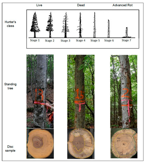 A 30 cm thick disc was collected in each tree at breast height. Figure 2 represents an example of a standing tree and a sampled disc for each decay level and associated Hunter’s class of American beech. The discs were stored at −5 °C until further analysis.
