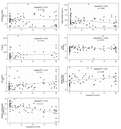 Relationships between proportion of wood area affected by rot and biomass properties.