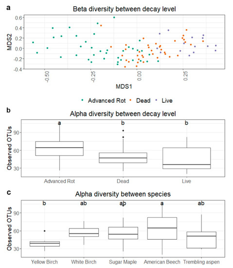 Beta diversity (nonmetric multidimensional scaling ordination of fungal community structure based on Bray-Curtis dissimilarity) between decay levels (a) and alpha diversity (expressed by the number of observed OTUs) between decay level (b) and species (c). Different letters indicate significant means difference, according to Tukey’s multiple comparisons of means test, with a 95% family-wise confidence interval.