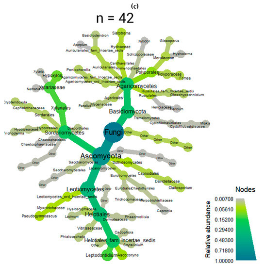 Distribution of the fungal diversity and relative abundance of fungi in wood from (a) live trees; (b) dead trees; (c) trees with advanced rot.