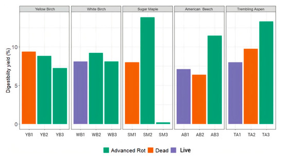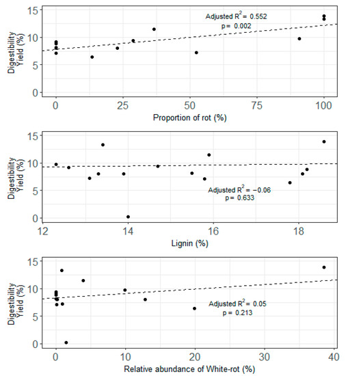 However, when tree degradation was based on the internal indicator of the proportion of wood area affected by rot, a significant (p-value = 0.002) positive relationship could be found among all samples with digestibility yield (Figure 7). On the other hand, our results did not show that lignin content (p-value: 0.633) or the relative abundance of white-rot fungi relative to all saprotrophs (p-value = 0.213) could drive the digestibility yield of carbohydrates (Figure 7).