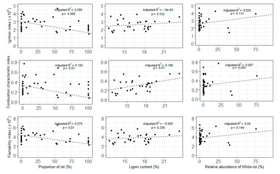 On the other hand, the combustion characteristic parameters were all significantly, and negatively, related to the % of wood area affected by rot (Figure 8). The amount of variability explained by these relationships (i.e., R-squared) was however low, ranging from 0.193 to 0.295. Moreover, a higher lignin content significantly increased (i.e., improved) the characteristic combustion index, which is an indicator of good fuel combustion. The linear relationships between the relative abundance of white-rot fungi compared to all saprotrophs and the thermochemical indexes were all nonsignificant.