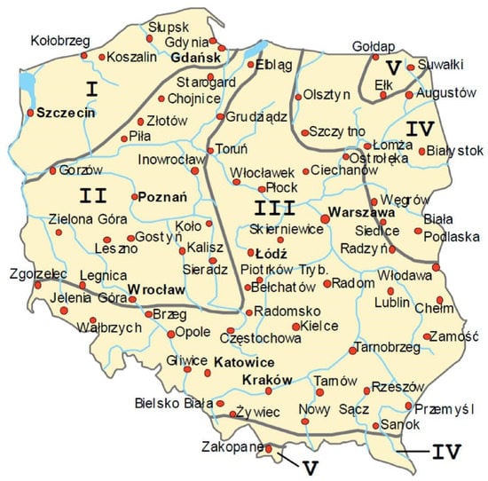 The research was performed for various variants of building outer walls, heat sources in heating systems and thermal insulation materials. Taking into consideration that Poland is divided into five climatic zones (see Figure 1), several locations in different climatic zones were selected, differing in the number of degree days of the heating season.